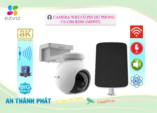 camera CS-CB8-R200-1M8WFL là một loại camera 360 ezviz Dung lượng pin 10. 400 mAh Độ phân giải tối đa 4K với đặc điểm kỹ thuật như sau trang bị khe cắm thẻ nhớ Micro SD dung lượng lên đến 512GB kết nối Wifi IP góc quay rộng với ống kính 3. 6mm