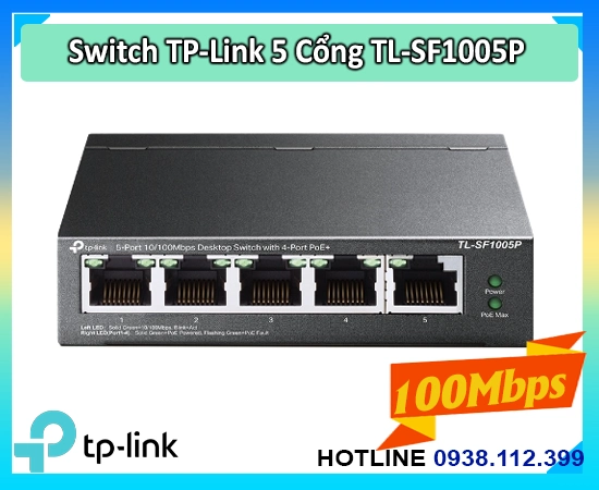 TP-Link TL-SF1005P có 5 cổng RJ45 10/100 Mbps, trong đó 4 cổng PoE+ chuẩn IEEE 802. 3af/at, hỗ trợ 30W mỗi cổng và tổng công suất 67W. Thiết bị cho phép truyền dữ liệu và nguồn xa tới 250m với chế độ ưu tiên cho cổng 1–2, cùng tính năng Plug & Play tiện lợi.
